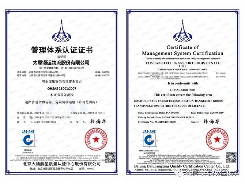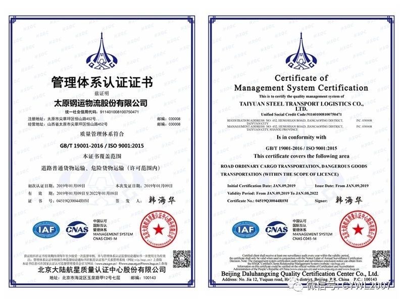 2019年1月,公司通過ISO9001質(zhì)量管理體系、ISO14001環(huán)境管理體系、ISO18001職業(yè)健康安全管理體系認(rèn)證。ISO三標(biāo)一體認(rèn)證的通過,標(biāo)志著公司始終踐行推進(jìn)冶金物流服務(wù)本質(zhì),持續(xù)強(qiáng)化以用戶為中心的服務(wù)理念;充分反映公司全力打造綠色****物流企業(yè)發(fā)展規(guī)劃的堅(jiān)定決心,同時(shí)通過提高職業(yè)健康安全管理水平、優(yōu)化管理流程、完善管理體系、規(guī)范作業(yè)標(biāo)準(zhǔn)等手段提升公司競爭力,為公司開拓市場、永續(xù)發(fā)展提供了有力保障。
